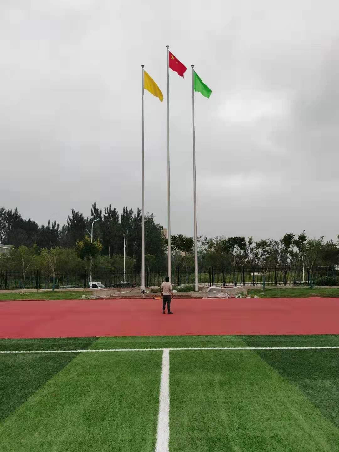 淮北市第一中學(東校區)19.58米和18米6支自動錐形旗桿,此次安徽耀龍旗桿為淮北市第一中學(東校區)19.58米和18米6支自動錐形旗桿為優質不銹鋼制造,旗桿錐形挺拔高大,是錐形外置式的旗桿,內藏不銹鋼繩,旗桿外無旗繩,免去旗桿與旗繩碰撞產生刮痕,從而可能導致桿體易生銹。